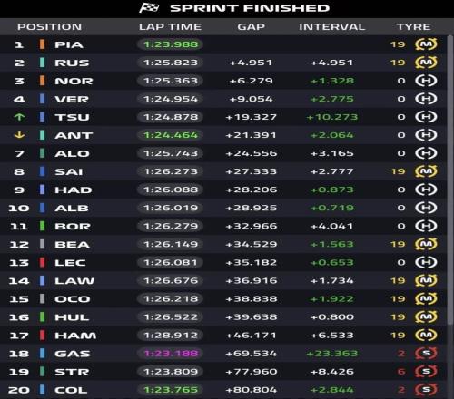 2025赛季F1卡塔尔大奖赛迎来了冲刺赛的争夺,最终,皮亚斯特里第一个冲过终点线获得冲刺赛冠军!拉塞尔第二,诺里斯第三,维斯塔潘第四。 稍早结束的冲刺排位赛上,几位还处在争冠行列的车手中,皮亚斯特里获得杆位,诺里斯第三发车,维斯塔潘仅仅排在第6位。 五盏红灯熄灭,比赛正式开始!维斯塔潘和角田完美配合,荷兰人很快就来到第四的位置!第2圈DRS开放,维斯塔潘和身前的诺里斯差距在1秒以内!第三圈他就开始向诺里斯发起攻击! 皮亚斯特里在第4圈刷紫已经带开身后的拉塞尔1秒半的差距,第8圈,前四的车手之间都拉开了1秒以上。 第13圈,阿隆索出弯失误被安东内利抓到,后者很快在大直道上完成超越。 同圈,角田连续4轮出白线被罚5秒,红牛即将宣布下赛季车手名单的大前提下,角田的席位已经岌岌可危了…… 最终,皮亚斯特里pole to win获得冠军,拉塞尔第二,诺里斯第三完赛,维斯塔潘第四,但从比赛的表现来看,这个分站红牛很难对麦克拉伦发起冲击,反倒是皮亚斯特里和诺里斯的争夺越发激烈。安东内利最后时刻也被罚时5秒,把第5的位置还给了角田。 |
