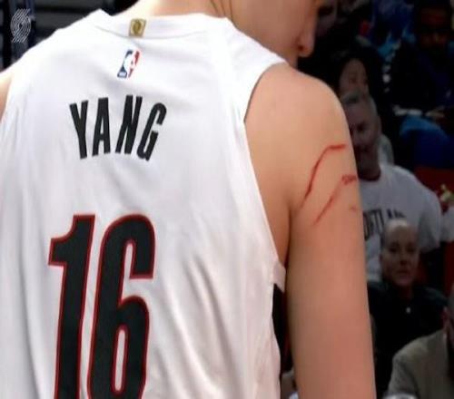 本场比赛,杨瀚森获得了相对多的出场时间,他也与火箭队主力中锋、联盟顶级力量内线史蒂文-亚当斯进行了正面对抗。在比赛期间,镜头给到了杨瀚森的右臂,赫然发现杨瀚森的右肩大臂附近出现了非常明显的两道大血印。 截至目前,杨瀚森充满斗志,与火箭内线缠斗过程中吃到了5次犯规。 |